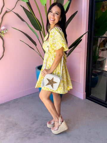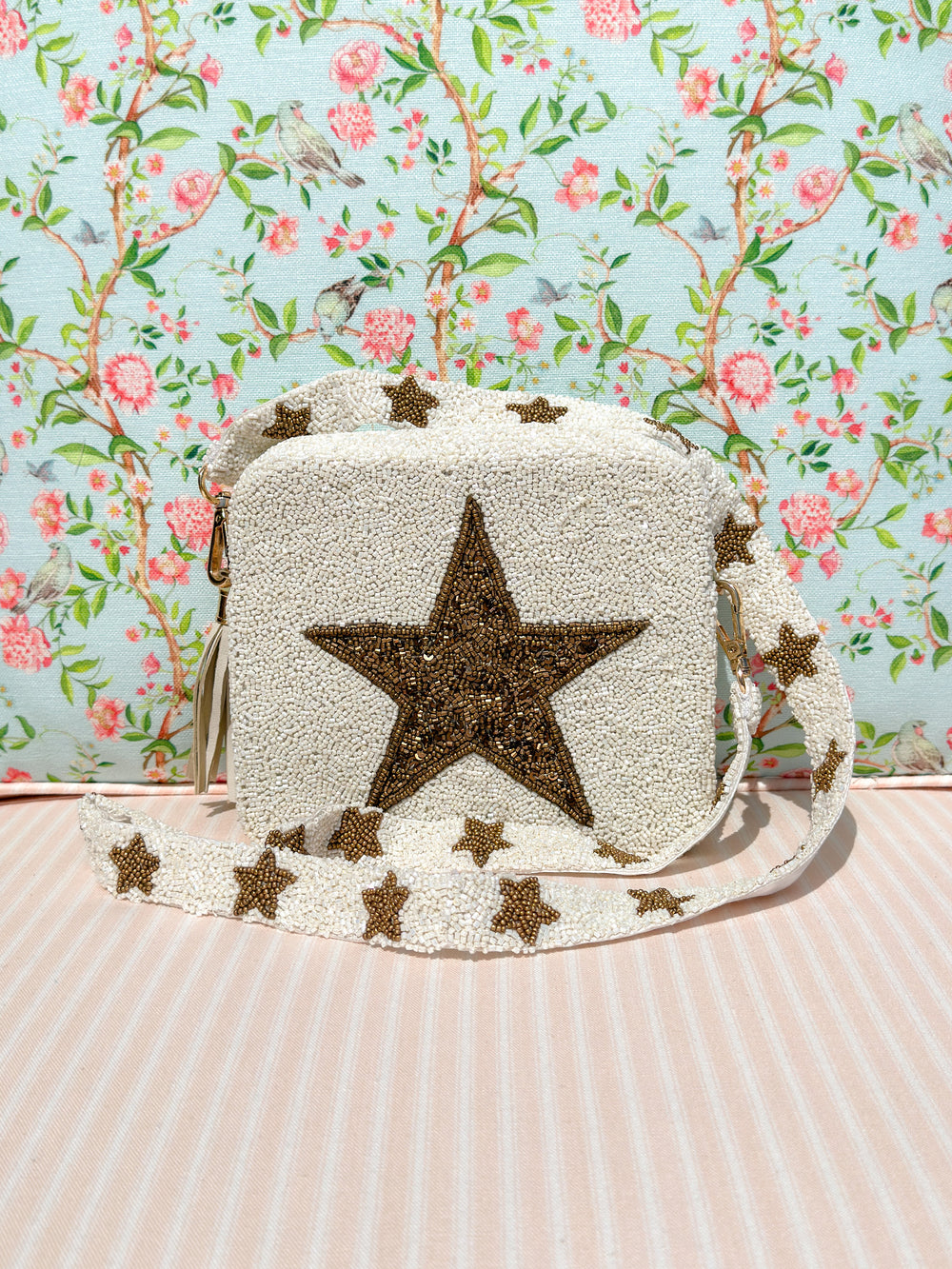 This White and gold beaded crossbody bag features a big star on the front of the bag and smaller stars all over the crossbody strap. Each bag is handmade, so each one is unique